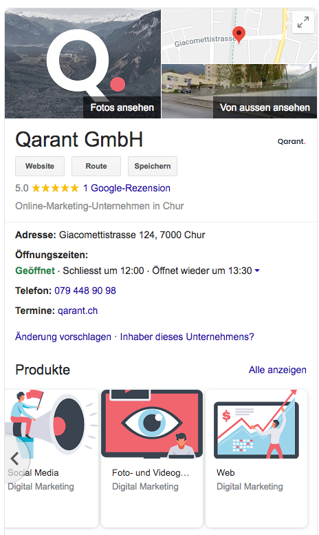 Hinterlegen Sie, wenn immer möglich, relevante Daten wie Kontaktinformationen, Öffnungszeiten, Links zu Ihren Webseiten oder Informationen zu Produkten und Dienstleistungen bei Branchenverzeichnissen wie local.ch, search.ch aber auch zum Beispiel bei lokalen Gewerbeverbänden.