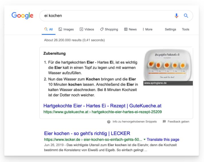 Sie können aber auch mit Suchmaschinenwerbung zusätzlich in den Suchergebnissen oder in Google Shopping präsent sein. Mit einem gut geschriebenen Blog-Beitrag oder gut aufbereiteten Daten auf Ihrer Webseite können Sie sich auch in den sogenannten «Featured-Snippets» oder auch «Position 0» platzieren.